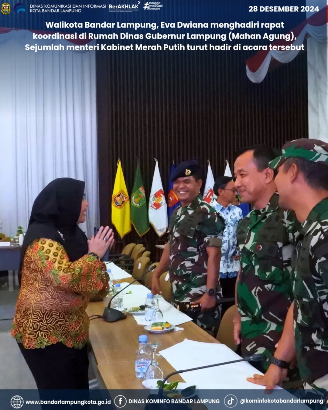Walikota Bandar Lampung, Hj. Eva Dwiana menghadiri rapat koordinasi di Rumah Dinas Gubernur Lampung (Mahan Agung), Sejumlah menteri Kabinet Merah Putih turut hadir di acara tersebut.