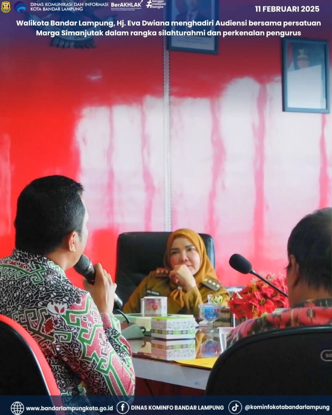 Walikota Bandar Lampung, Hj. Eva Dwiana menghadiri Audiensi bersama Persatuan Marga Simanjutak dalam rangka silahturahmi dan perkenalan pengurus oleh Pemerintah Kota Bandar Lampung.
