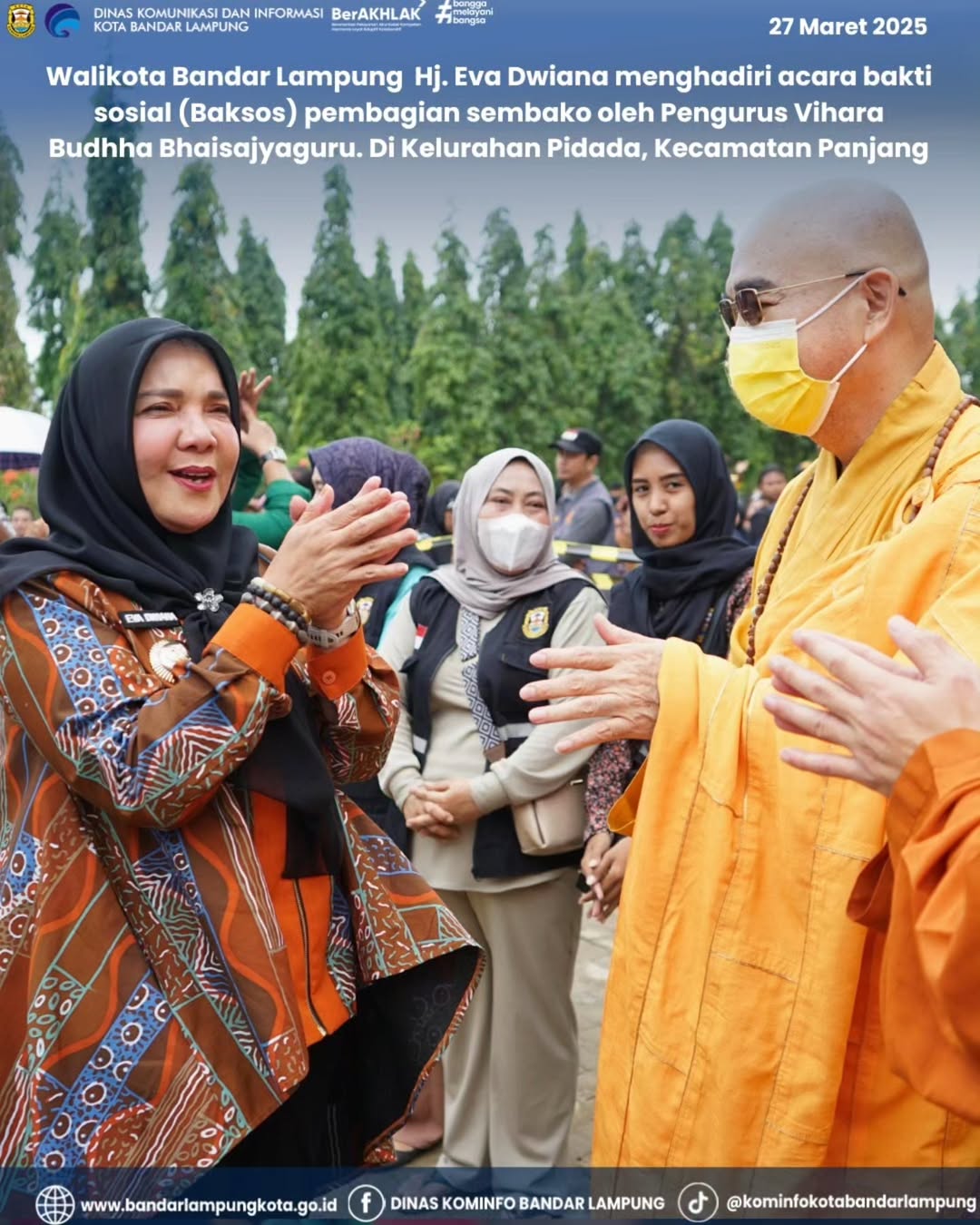 Walikota Bandar Lampung, Hj. Eva Dwiana menghadiri acara Bakti Sosial (Baksos) pembagian sembako oleh Pengurus Vihara Budhha Bhaisajyaguru. Di Kelurahan Pidada, Kecamatan Panjang. Kamis, 27/03/2025.