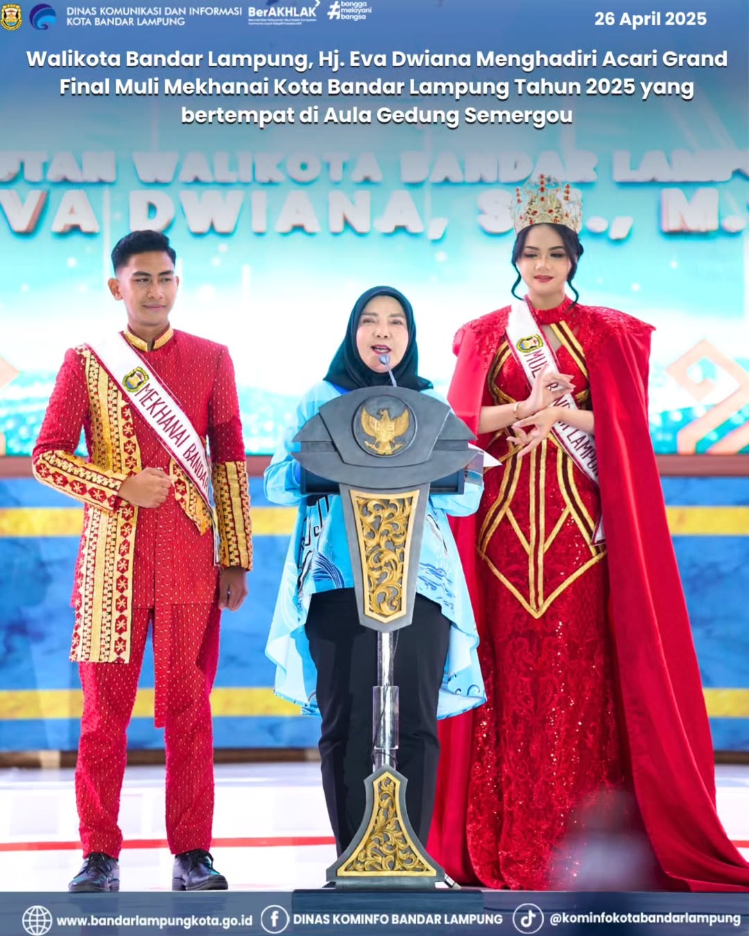 Walikota Bandar Lampung, Hj. Eva Dwiana Menghadiri Acara Grand Final Muli Mekhanai Kota Bandar Lampung Tahun 2025 yang bertempat di Aula Gedung Semergou, Sabtu Malam (26/04/2025).