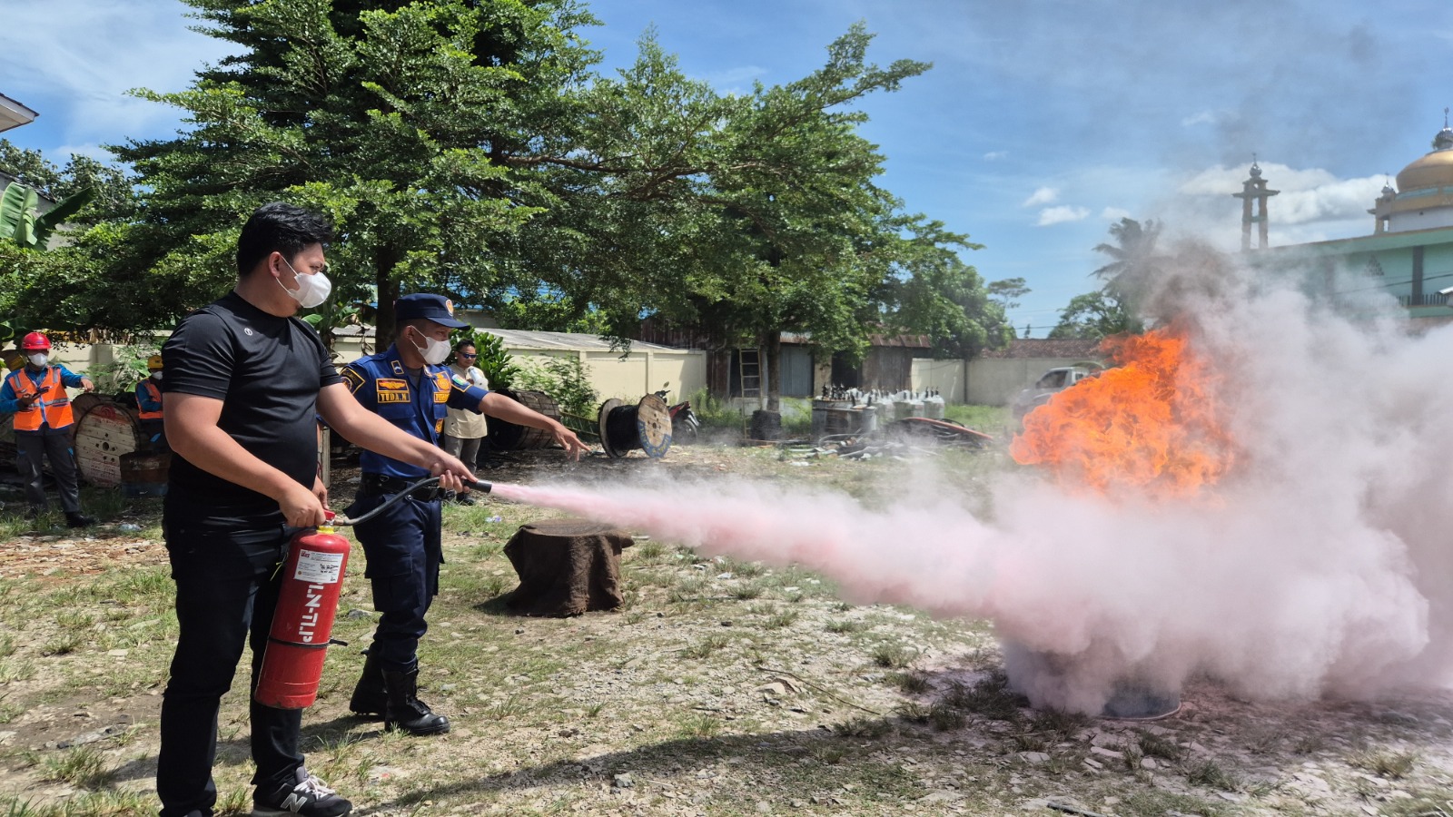 Setelah penyampaian materi, peserta mengikuti praktik pemadaman api menggunakan karung goni basah dan APAR, dipandu oleh Satgas Damkar Pringsewu. Seluruh peserta diberi kesempatan memadamkan api secara langsung untuk membiasakan diri dengan prosedur lapangan. Kegiatan juga dilanjutkan dengan simulasi evakuasi gempa menggunakan teknik Drop, Cover, and Hold On serta tata cara penyelamatan yang aman.