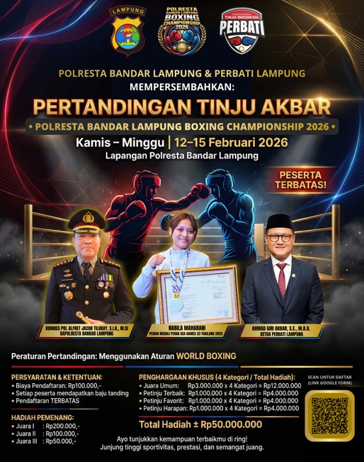 Bandar Lampung – Polresta Bandar Lampung bekerja sama dengan Persatuan Tinju Amatir Indonesia (Perbati) Lampung akan menggelar pertandingan tinju bertajuk Polresta Bandar Lampung Championship 2026. Kegiatan tersebut akan berlangsung selama empat hari, mulai Kamis hingga Minggu, 12–15 Februari 2026, di Lapangan Polresta Bandar Lampung.
